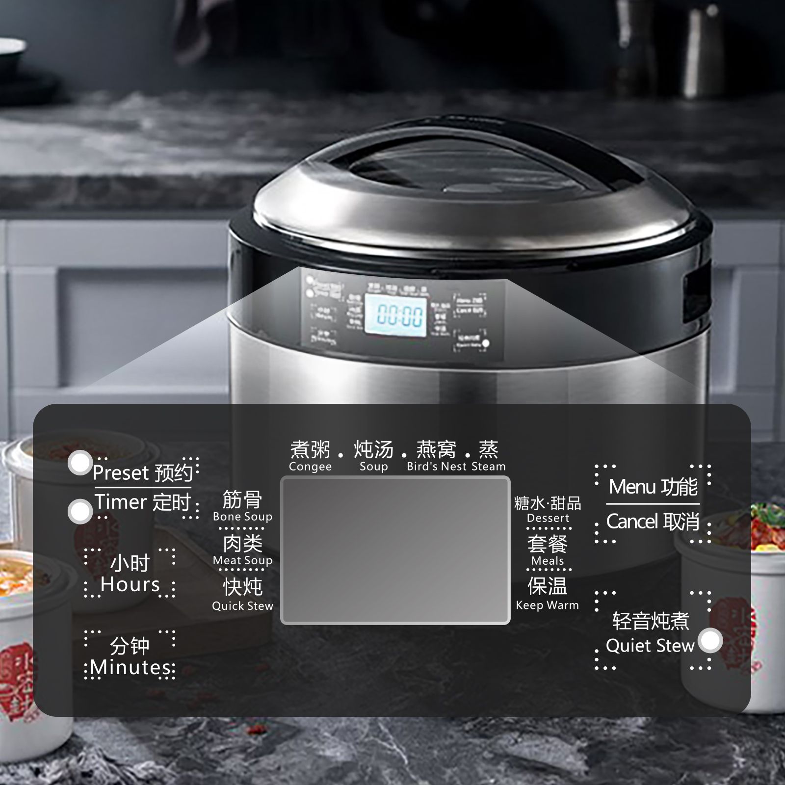 2.9 Preset Programs Includes Quick Stew, Soup, Congee, Bird’s Nest, Steam, Dessert, and more each with adjustable cooking time up to 12 hours.