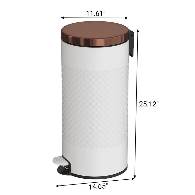 A retro look round shape 8 gallon/30-liter stainless steel trash can with hands-free operation and a quiet slow close lid. The strong foot pedal structure will provide many years of trouble-free use. A removable inner plastic bucket can be used with or without a trash bag. A large back handle makes for convenient moving and lifting. A non-skid base keeps the trash can steady and protects floors. Carbon steel with white color finish.