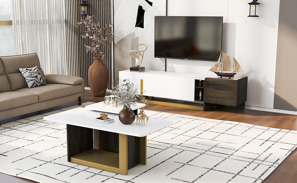 Upgrade your living space with this elegant and functional Light Luxury TV Cabinet and Coffee Table Set. Combining a sophisticated white finish with classic wood grain and gold accents, this furniture set offers both modern aesthetics and practicality. Featuring durable MDF construction and sturdy metal frames, this set brings a high-end touch to any room while providing ample storage and display space.